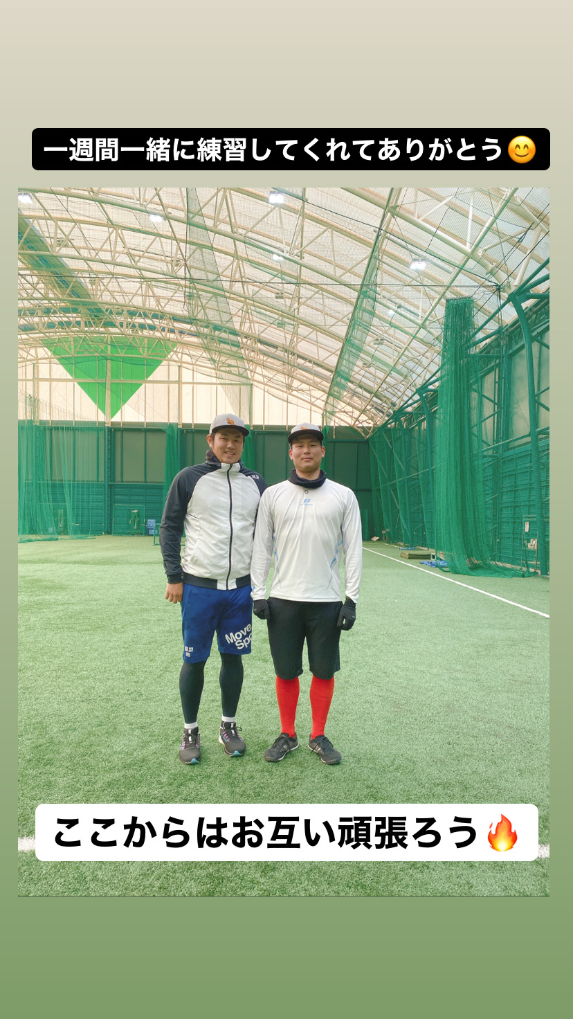 昨シーズンの新人王・栗林投手から1月10日から16日まで一緒に自主トレしてた、巨人の堀岡くんとのショットです。